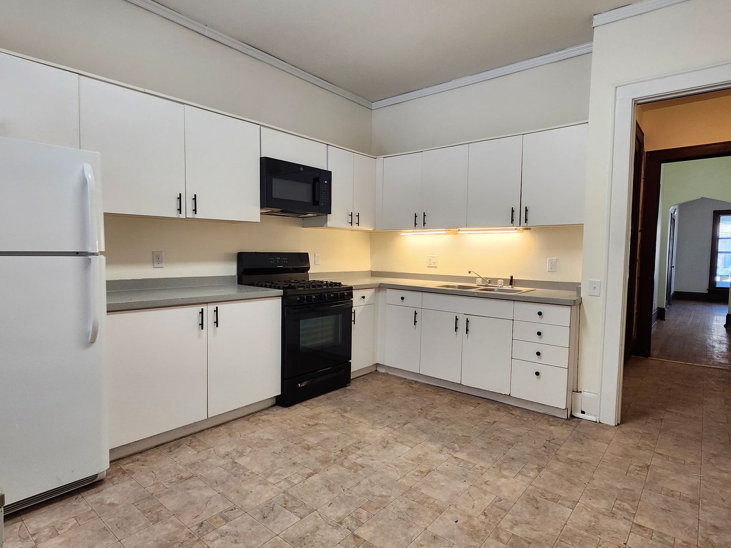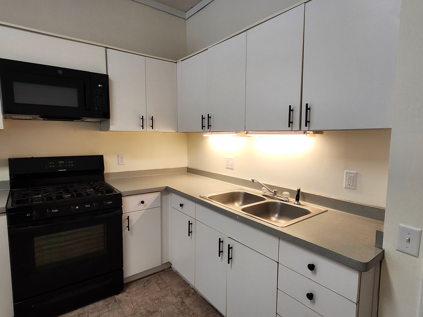 Kitchen has a portable dishwasher, gas stove, microwave above the stove, fridge, and garbage disposal